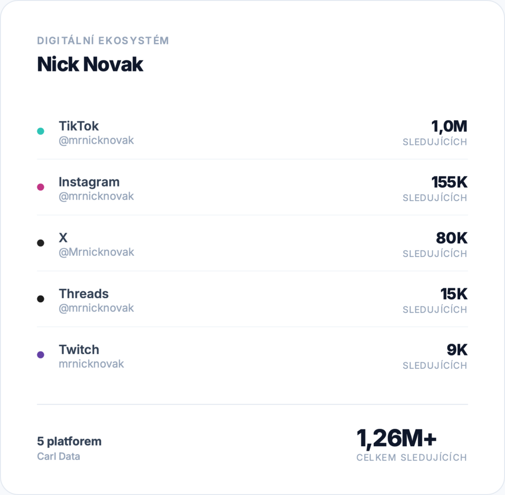 TikTok (@mrnicknovak, 1M+ followerů, 60M+ lajků) je jeho domovskou základnou plnou aktuálních trendů, tanečních kreací i zákulisí ze života sportovce. V době olympiády navíc plný zákulisí nejen z olympijské vesnice.